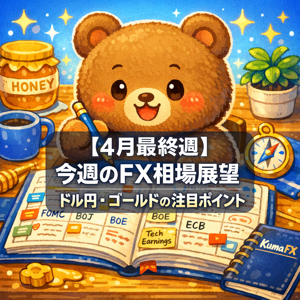 今週はFOMC・日銀・BOE・ECBの4中銀が集中するうえ、ビッグテック5社の決算が重なる年間最高レベルのリスクウィークです。特に4月29日(水)はFOMC発表が日本時間深夜(27:00)に行われ、その前後でマイクロソフト・Amazon・Meta・Alphabetの決算も控えています。さらに同日は日本が祝日で流動性が薄く、予想外の値動きには特に注意が必要です。